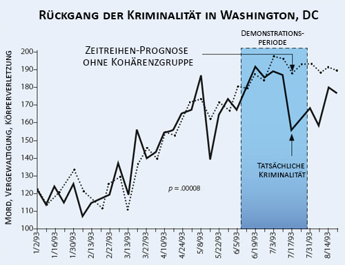 Als sich im Sommer 1993 eine Gruppe von 4000 Yogischen Fliegern für mehrere Wochen in Washington, D.C. versammelte, nahmen die Gewaltverbrechen um fast 25% ab (siehe Darstellung unten). Diese Untersuchung wurde 1999 in der von Experten begutachteten Fachzeitschrift Social Indicators Research veröffentlicht (1999, 47(2):153-201).