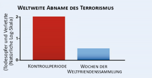 Eine Meta-Analyse von drei voneinander unabhängigen Experimenten zeigte eine Abhame des weltweiten Terrorismus um 72%.