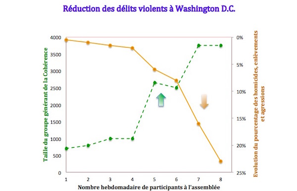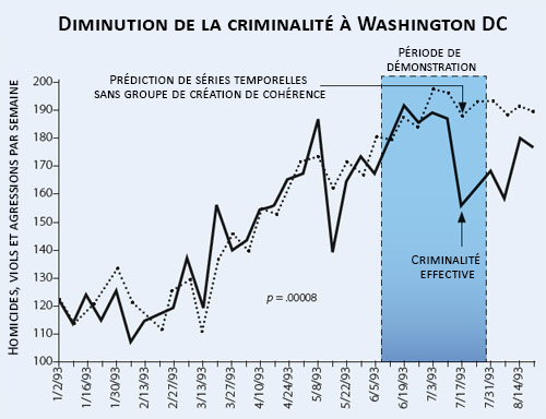 Au cours de l’été 1993 à Washington, un groupe de 4 000 experts de la technologie du vol yogique s’est rassemblé pendant plusieurs semaines. Résultat : La criminalité avec violence a diminué de près de 25% à Washington DC (voir diagramme ci-dessous). Cette recherche a été publiée en 1999 dans Social Indicators Research, revue indépendante avec comité de lecture.