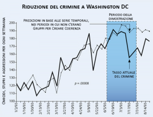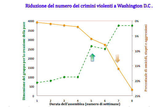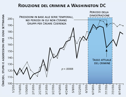 Quando, per diverse settimane nell’estate del 1993, un gruppo di 4.000 Volatori Yoga si è riunito a Washington DC, si è riscontrata una riduzione di circa il 25% del crimine violento (vedere grafico in basso). Questa ricerca è stata pubblicata nel 1999 dalla rivista peer-reviewed Social Indicators Research. Social Indicators Research 1999 47(2):153-201.