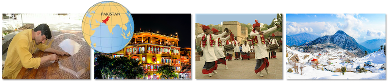From left to right: Wood crafts are very refined in Pakistan / Night street in Lahore city / Traditional folk dance Bhangra, Punjab province / Snowy village in mountains