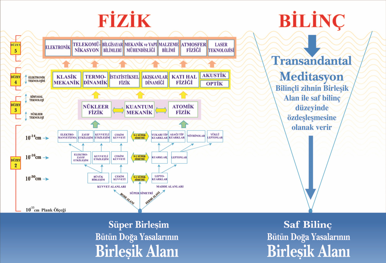 Örneğin, modern fizik doğanın işleyişinde daha kısa zaman ve mesafe ölçeklerinde birleşik seviyeler saptadı. Bu çalışmalar, evrendeki bütün farklı kuvvetleri ve parçacıkları birbirine bağlayan ve temelini oluşturan birleşik alanın (süper sicim alanı) buluşu ile neticelendi (sağdaki tabloda ayrıntılı olarak inceleyebilirsiniz).
