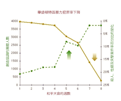 1993年夏天,在美国的华府,当有4,000位瑜珈飞行员聚集数周时,暴力犯罪率下降了几乎达25%(详下图)。本研究于1999年发表于由专业人士严格审阅的期刊《社会指数研究》(Social Indicators Research)之中。