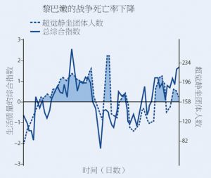在1980年代黎巴嫩战争期间,研究显示的许多结果中,战争死亡率下降76%。